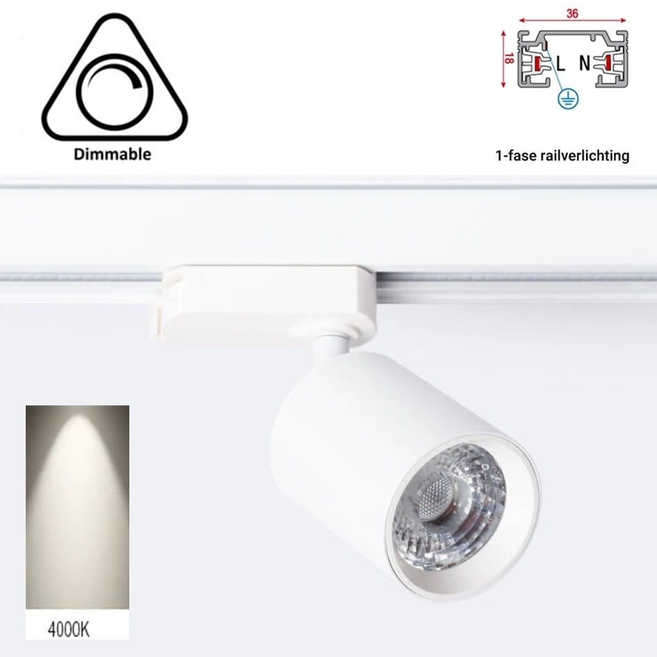 1 Fase Rail Spot Mal, 10w, 1000 Lumen, Dimbaar, Lichthoek:15 graden, Wit, 2 Jaar garantie