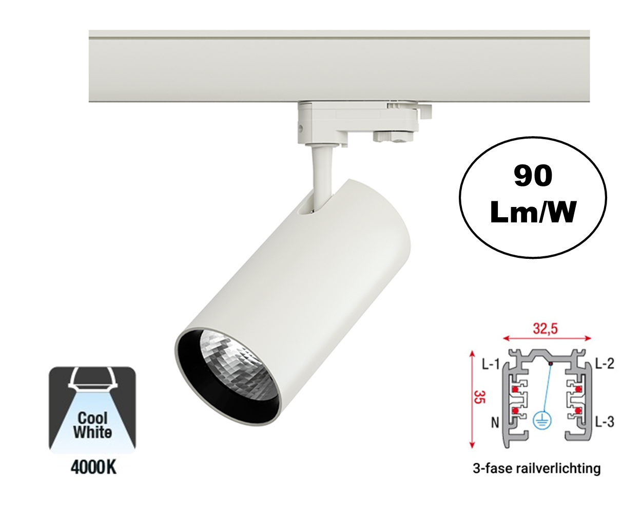 Zeer hoogwaardige kwaliteit 3 Fase LED Railspot 20w met kokervormige behuizing. Deze 3 Fase Led Railspot 20w heeft maar liefst 1800 lumen met COB led en daarom zeer geschikt voor het belichten van showrooms, boetiek en winkels. Dankzij de hoge lumen vervangt de LED Railspot 20w een 75-125w Gasontlading Lamp.