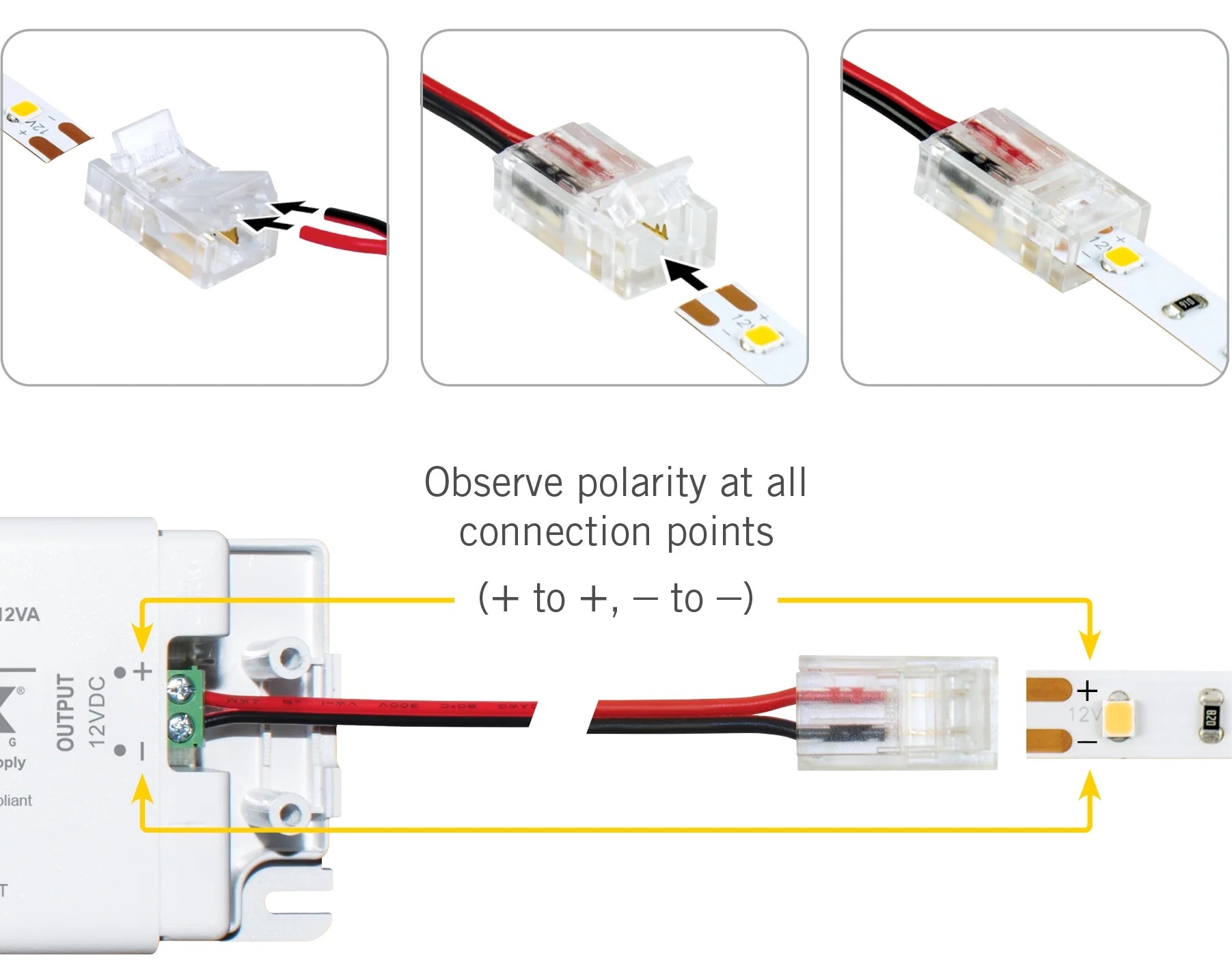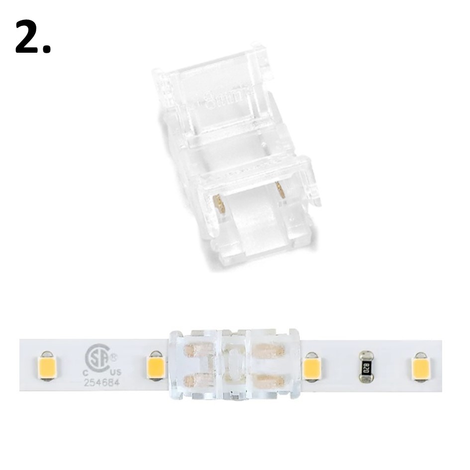 Tip! Gebruik de aansluitconnectoren ook voor het maken van strip tot strip connector waarbij je 2 aansluitconnectoren op een 2 aderig LED strip draad monteert. Ideaal wanneer je een tussenafstand tussen 2 LED strips wilt of wanneer je een hoekverbinding wilt maken.