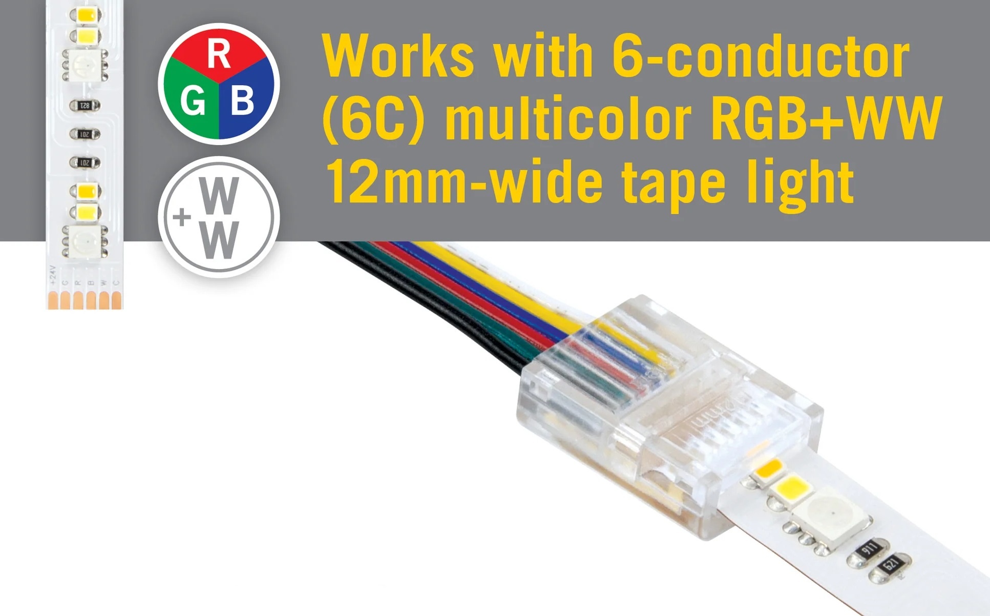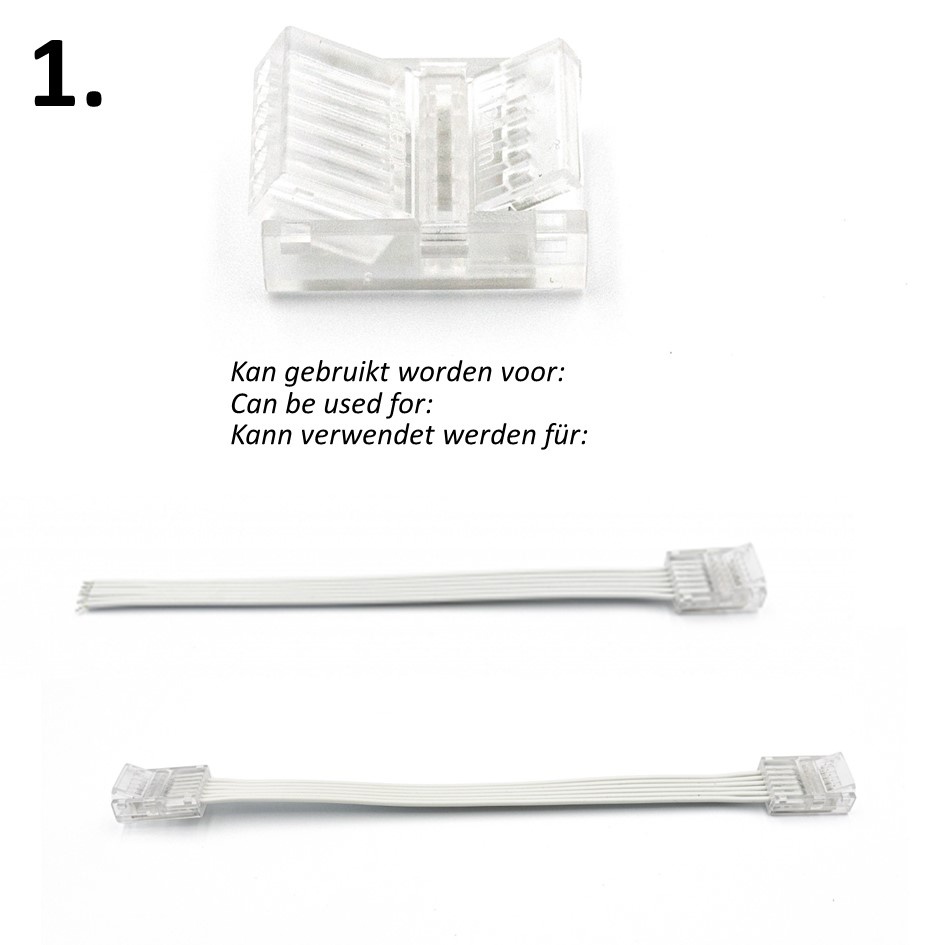 Tip! Gebruik de aansluitconnectoren ook voor het maken van strip tot strip connector waarbij je 2 aansluitconnectoren op een 6 aderig LED strip draad monteert. Ideaal wanneer je een tussenafstand tussen 2 LED strips wilt of wanneer je een hoekverbinding wilt maken.