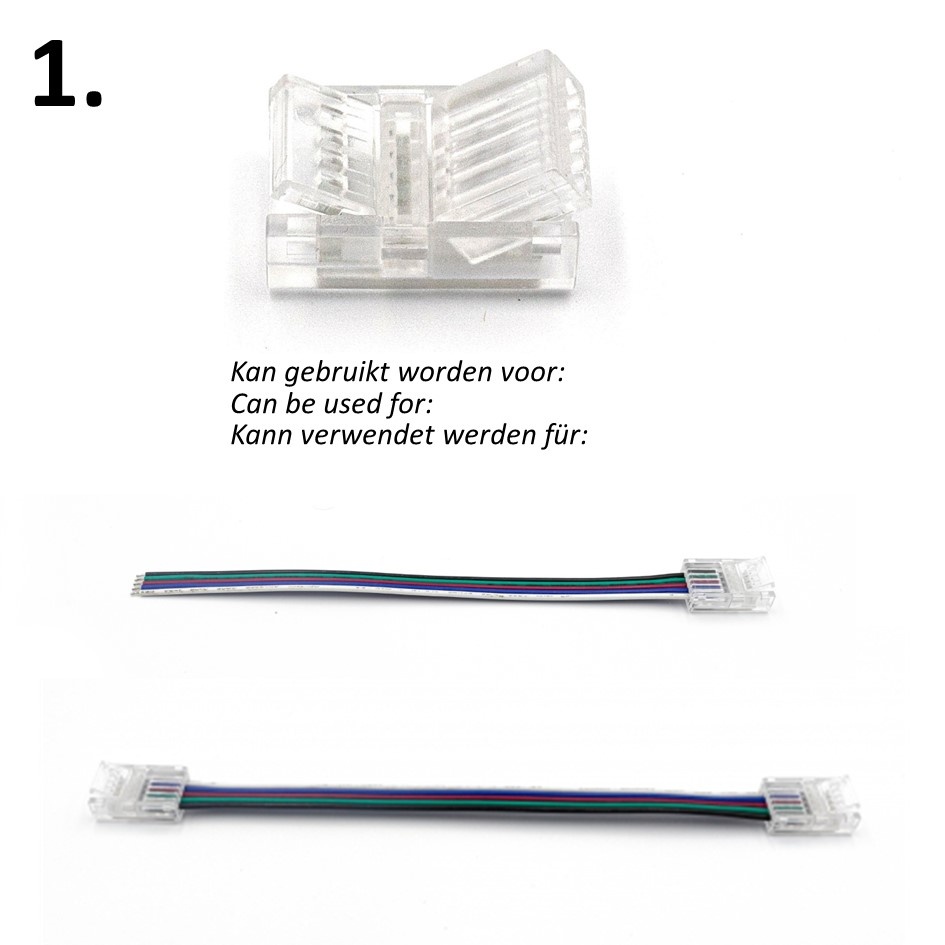 Tip! Gebruik de aansluitconnectoren ook voor het maken van strip tot strip connector waarbij je 2 aansluitconnectoren op een 5 aderig LED strip draad monteert. Ideaal wanneer je een tussenafstand tussen 2 LED strips wilt of wanneer je een hoekverbinding wilt maken.