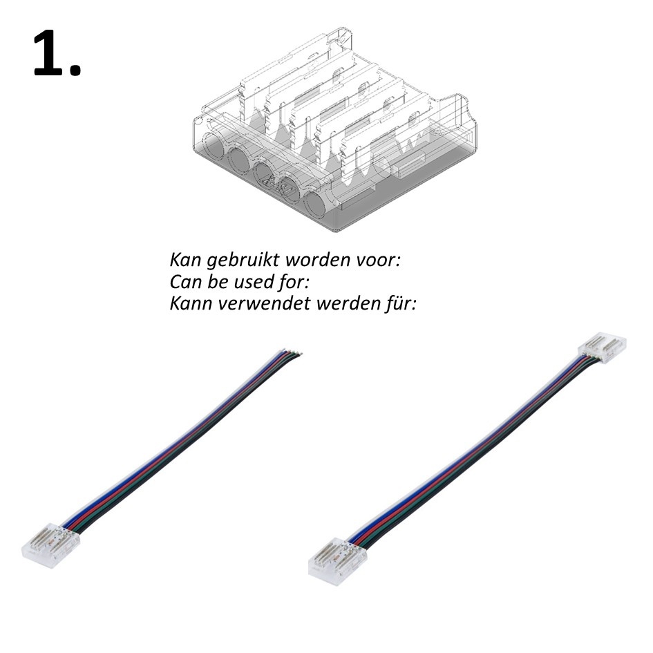 Tip! Gebruik de aansluitconnectoren ook voor het maken van strip tot strip connector waarbij je 2 aansluitconnectoren op een 5 aderig LED strip draad monteert. Ideaal wanneer je een tussenafstand tussen 2 LED strips wilt of wanneer je een hoekverbinding wilt maken.