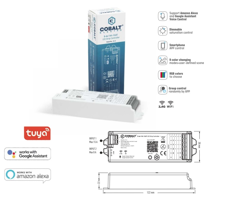 Deze Wifi Smart LED Strip Controller is speciaal ontworpen om alle soorten LED-strips te bedienen via een app op je smartphone. De smart wifi LED controller kan gebruikt worden op Single Color, CCT (Dualwhite), RGB, RGB+W en RGB+CCT LED strips dit maakt het een 5 in 1 LED controller. Via de App kan je strip de gewenste lichtkleur (bij meerkleurige LED strips) en helderheid instellen. Ook kan je heel eenvoudig taken of timers instellen.