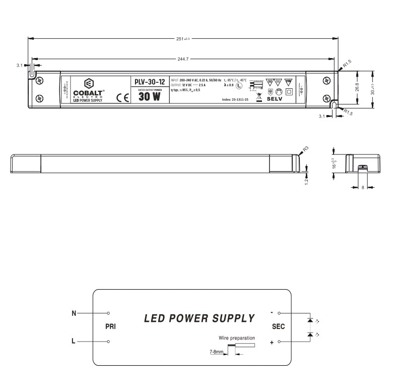 Deze LED strip voeding heeft een maatvoering van 251x30x16mm en is daarom zeer geschikt voor het gebruik in kasten, wanden en plafond met minimale inbouwhoogte.