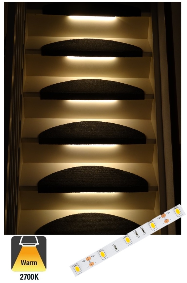 Deze set bestaat uit LED strip verlichting op lengte gemaakt voor toepassing onder de traptreden. Zet je trap in het licht en voorzie elke traptreden van een mooi lichtstrip. Of plaats om de traptreden een strip om het iets rustiger effect te krijgen.