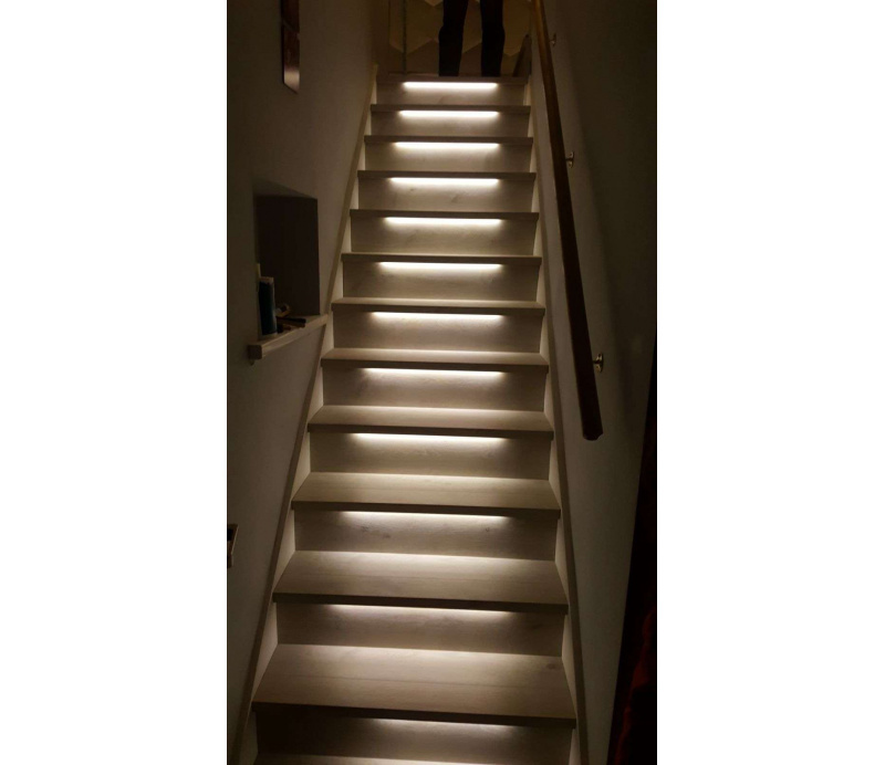 Deze set bestaat uit LED strip verlichting op lengte gemaakt voor toepassing onder de traptreden. Zet je trap in het licht en voorzie elke traptreden van een mooi lichtstrip. Of plaats om de traptreden een strip om het iets rustiger effect te krijgen.