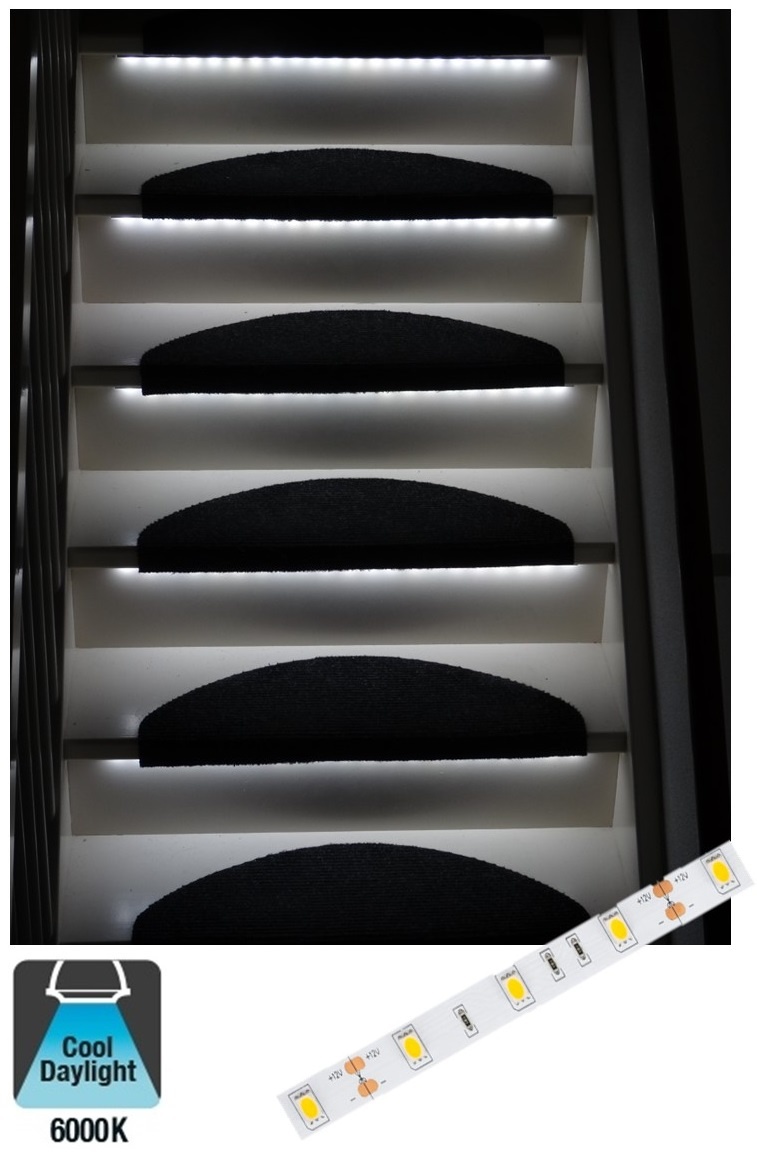 Deze set bestaat uit LED strip verlichting op lengte gemaakt voor toepassing onder de traptreden. Zet je trap in het licht en voorzie elke traptreden van een mooi lichtstrip. Of plaats om de traptreden een strip om het iets rustiger effect te krijgen.
