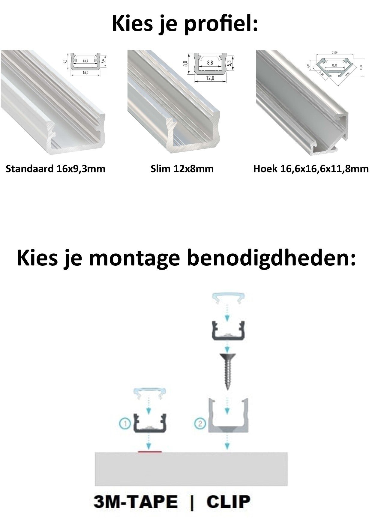 Standaard wordt het pakket geleverd met een profiel van BxH 16x9,3mm. Het is mogelijk het profiel te veranderen naar een smaller model 12x8mm of een hoekprofiel.