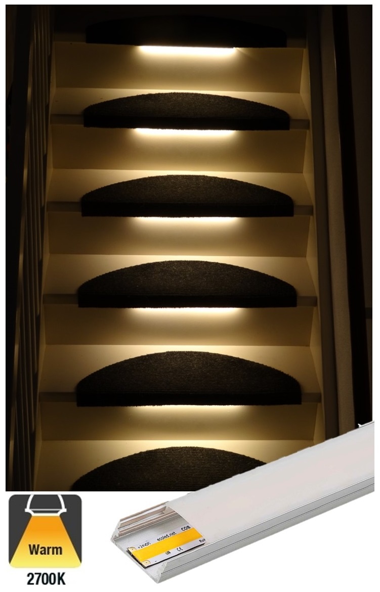 Deze set bestaat uit LED strip verlichting op lengte gemaakt voor toepassing onder de traptreden. Zet je trap in het licht en voorzie elke traptreden van een mooi lichtstrip. Of plaats om de traptreden een strip om het iets rustiger effect te krijgen. Elke LED strip is voorzien van een Aluminium profiel op lengte van 31 cm. De profiel zorgt voor een nette afwerking, bescherming en koeling voor de LED strip.