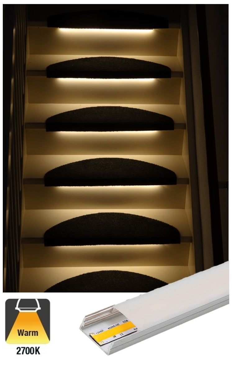 Deze set bestaat uit LED strip verlichting op lengte gemaakt voor toepassing onder de traptreden. Zet je trap in het licht en voorzie elke traptreden van een mooi lichtstrip. Of plaats om de traptreden een strip om het iets rustiger effect te krijgen. Elke LED strip is voorzien van een Aluminium profiel op lengte van 51 cm. De profiel zorgt voor een nette afwerking, bescherming en koeling voor de LED strip.