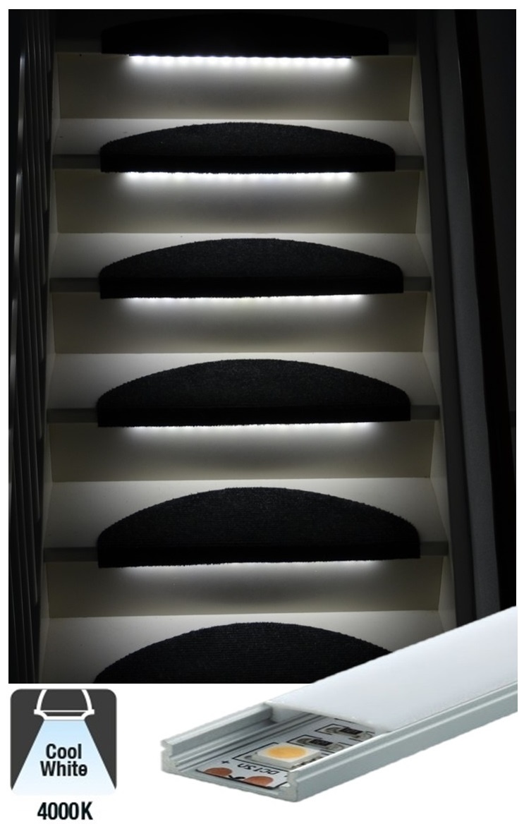 Deze set bestaat uit LED strip verlichting op lengte gemaakt voor toepassing onder de traptreden. Zet je trap in het licht en voorzie elke traptreden van een mooi lichtstrip. Of plaats om de traptreden een strip om het iets rustiger effect te krijgen. Elke LED strip is voorzien van een Aluminium profiel op lengte van 11 cm. De profiel zorgt voor een nette afwerking, bescherming en koeling voor de LED strip.