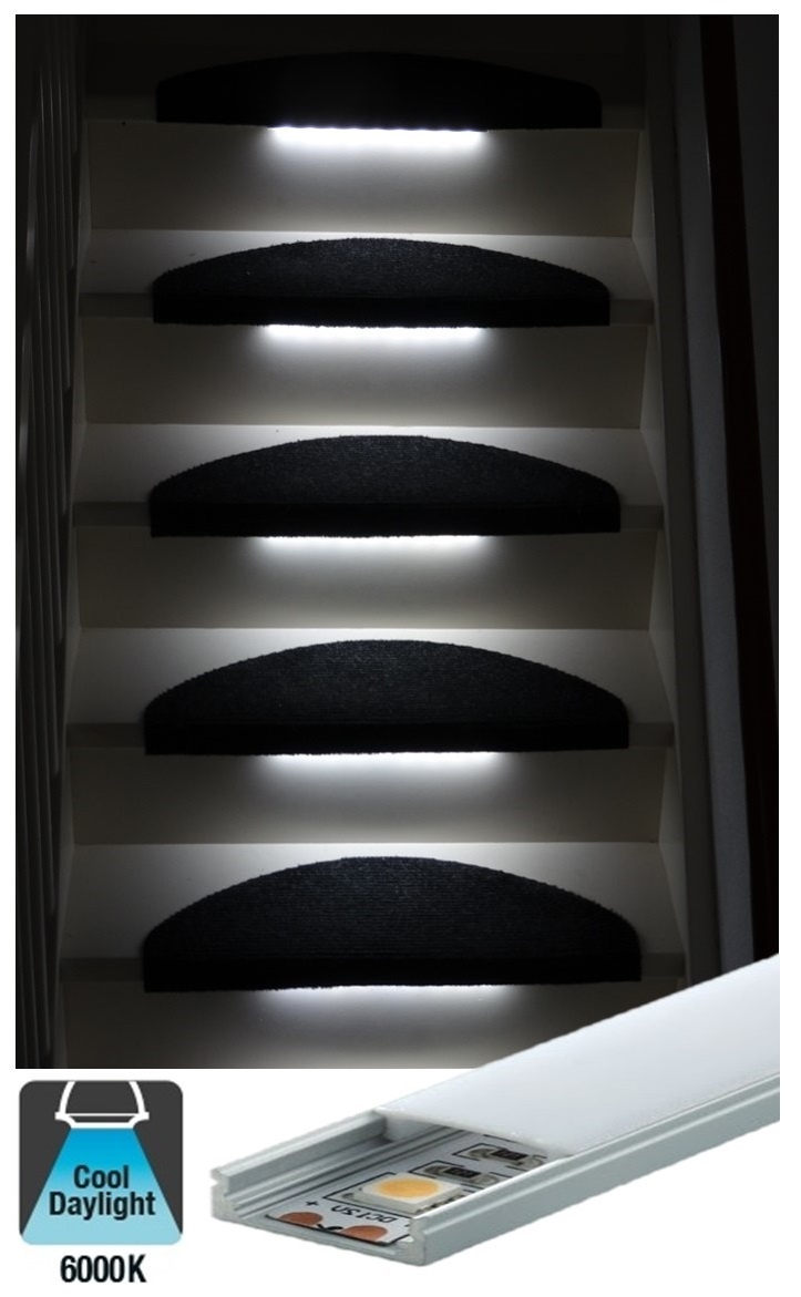 Deze set bestaat uit LED strip verlichting op lengte gemaakt voor toepassing onder de traptreden. Zet je trap in het licht en voorzie elke traptreden van een mooi lichtstrip. Of plaats om de traptreden een strip om het iets rustiger effect te krijgen. Elke LED strip is voorzien van een Aluminium profiel op lengte van 21 cm. De profiel zorgt voor een nette afwerking, bescherming en koeling voor de LED strip.