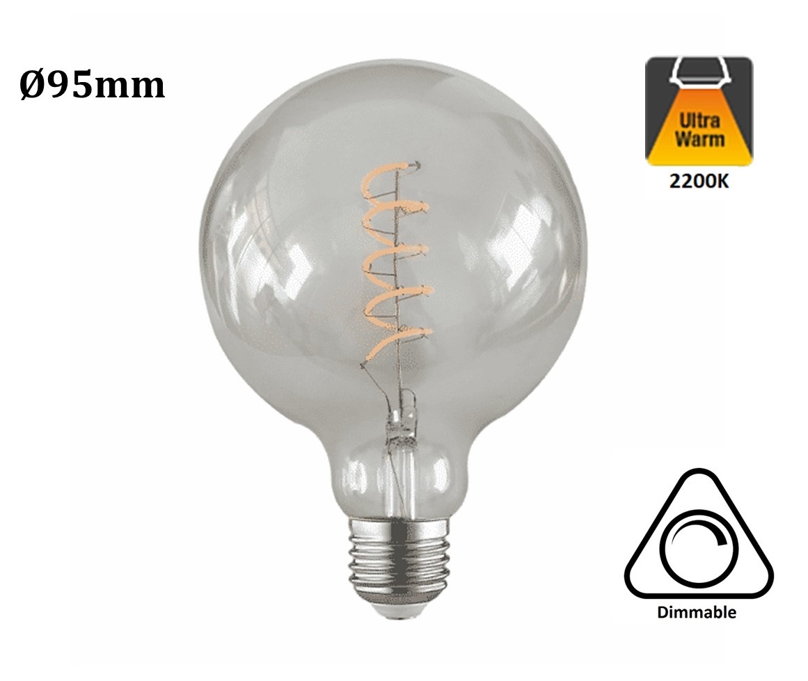 Zeer unieke decoratieve vintage E27 4w led lamp 2200K dimbaar. Dankzij de lage wattage en lumen van is de dimbare E27 Globe 95 Led lamp zeer goed om in het zicht te gebruiken. De lage 180 lumen zorgt ervoor dat de Globe 95 E27 4w filament led lamp geen hinderlijke belichting afgeeft.
