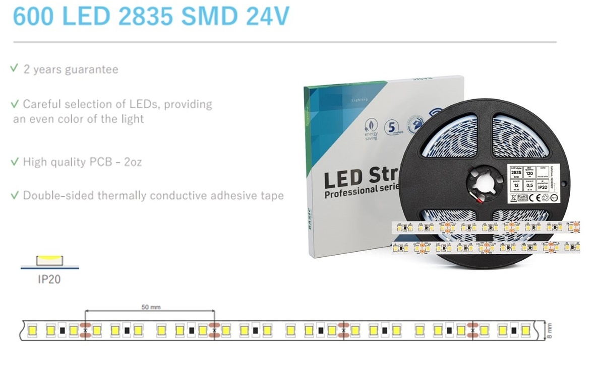 Deze led strip 2835 smd in 4000K Neutraal wit werkt op een 24v constante spanning. Wij hebben in ons assortiment diverse wattage 24v constante led strip drivers.