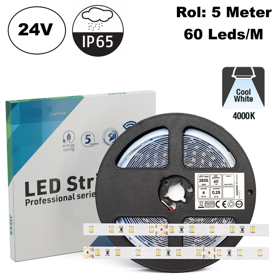 Deze led strip 2835 smd in 4000K neutraal wit werkt op een 24v constante spanning. Wij hebben in ons assortiment diverse wattage 24v constante led strip drivers.