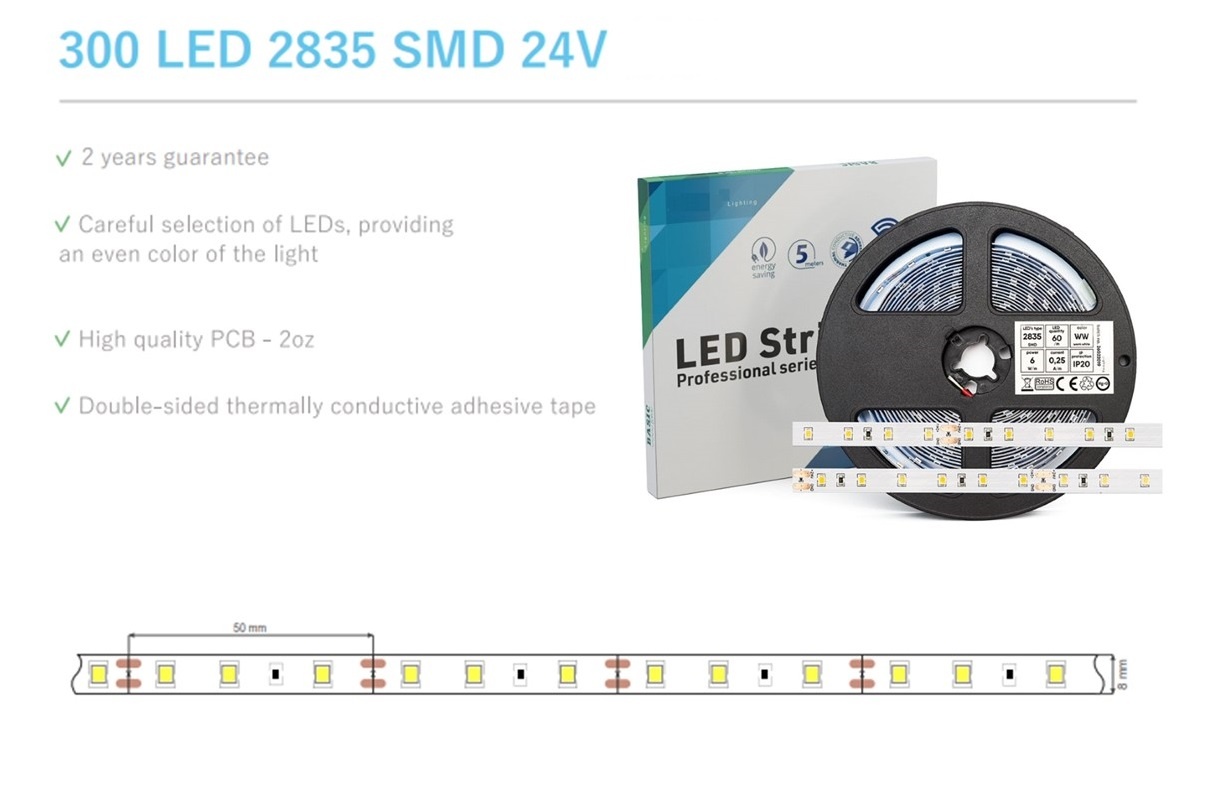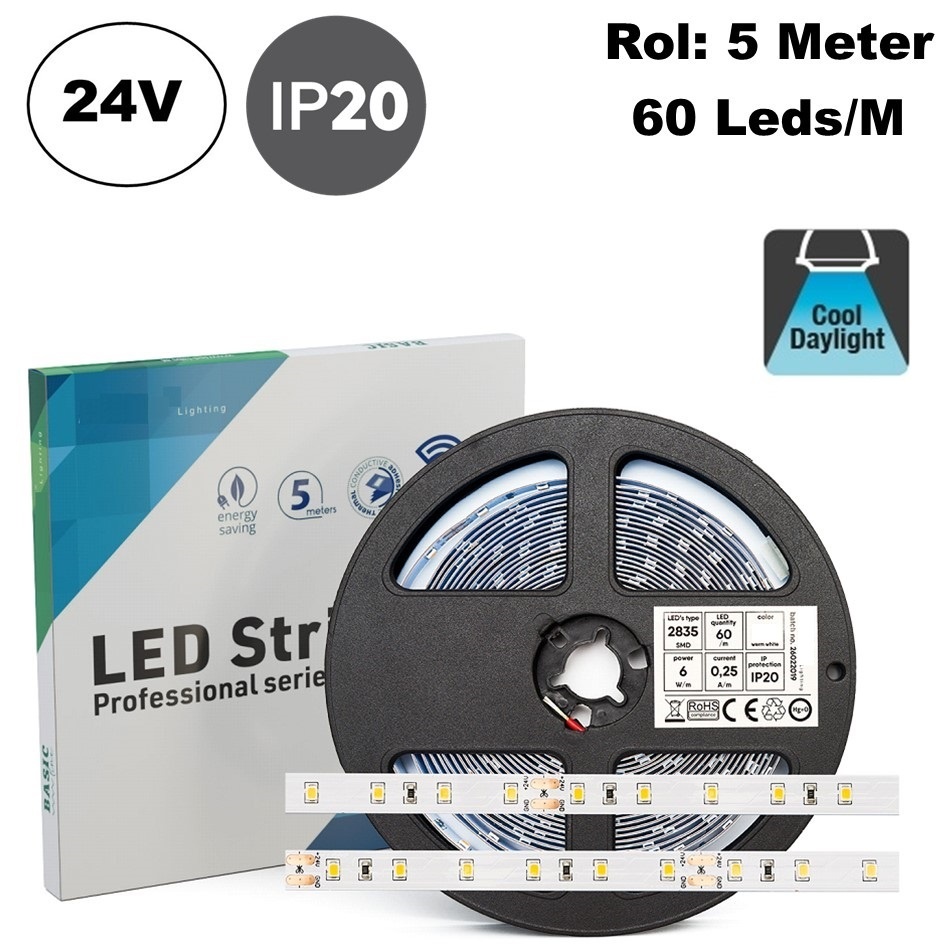 Deze led strip 2835 smd in 6500K daglicht wit werkt op een 24v constante spanning. Wij hebben in ons assortiment diverse wattage 24v constante led strip drivers.