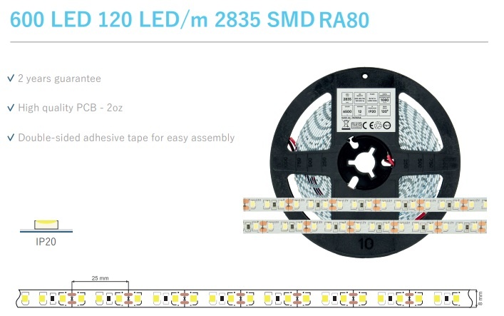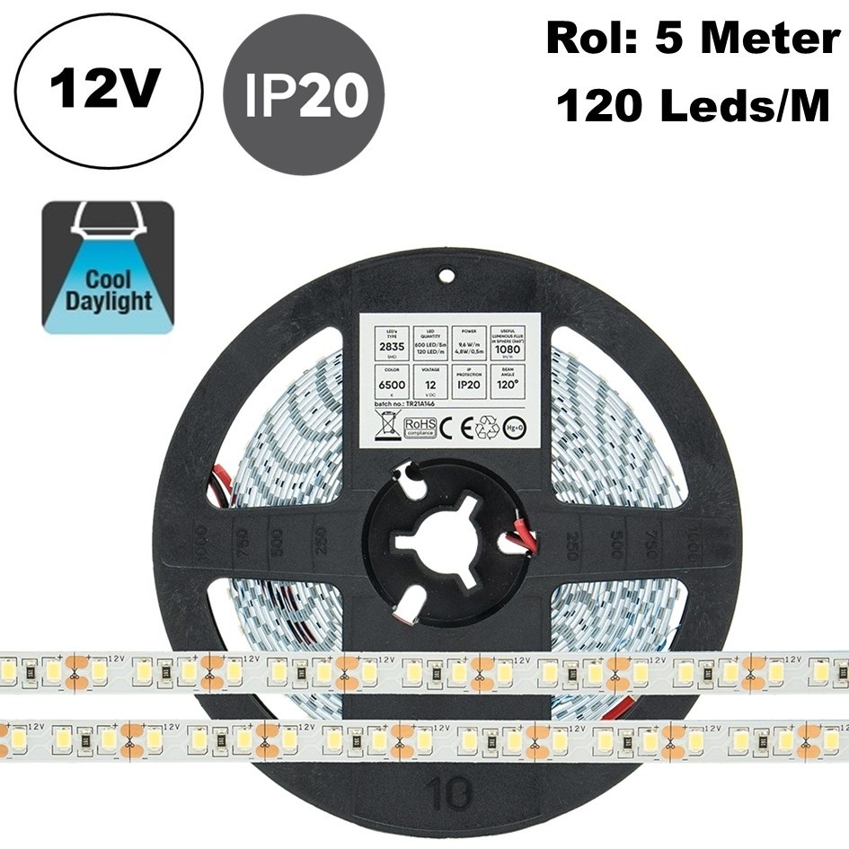 Deze 6500K daglicht witte Led Strip met krachtige SMD 2835SMD heeft 120 leds per meter. Met een zeer goede lichtopbrengst van 1080 lumen per meter zeer geschikt als sfeermaker in elke ruimte. Deze led strip heeft een IP20 normering wat betekent dat deze voor binnenshuis gebruik kan worden.