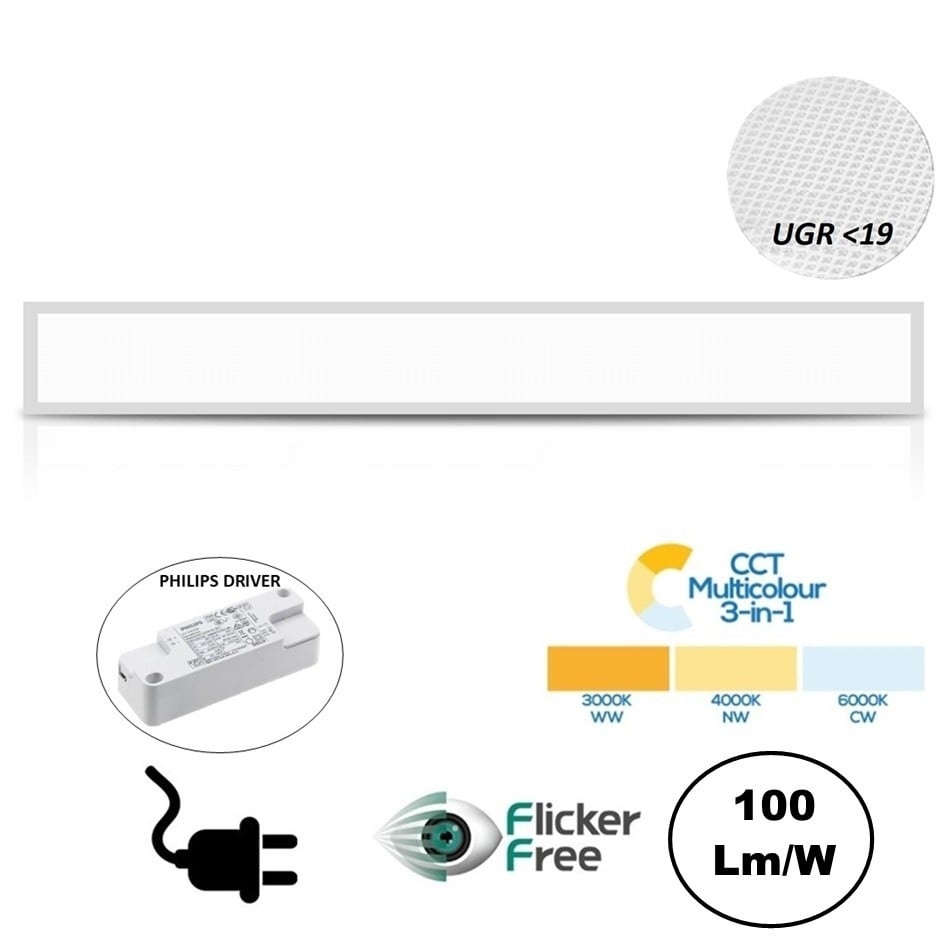 Standaard is de 120x15cm UGR19 Flat led paneel uitgerust met 3CCT-switch schakelaar. De lichtkleuren 3000K, 4000K en 6000K zijn gemakkelijk in te stellen middels de switch aan het paneel. Het armatuur wordt standaard geleverd met een Philips Certa LED Driver. Selecteer hiervoor de driver met het gewenste wattage. Voor vervanging van een TL-buis 28w(T5) of 36w(T8) watt adviseren wij de 20 watt Philips CertaDriver. Voor 2 TL-buizen van 28w(T5) of 36w(T8) watt een 35 watt Philips CertaDriver.