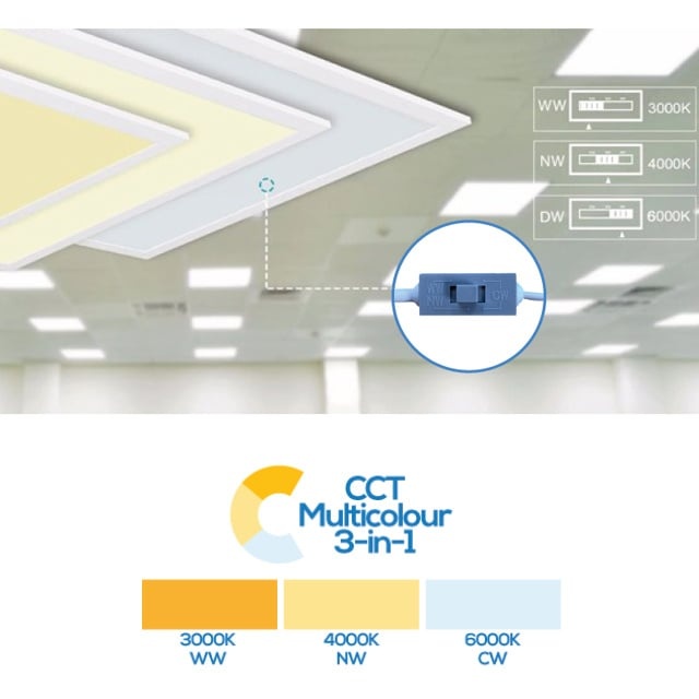 Standaard is de 150x20cm UGR19 Flat led paneel uitgerust met 3CCT-switch schakelaar. De lichtkleuren 3000K, 4000K en 6000K zijn gemakkelijk in te stellen middels de switch aan het paneel. Het armatuur wordt standaard geleverd met een Philips Certa LED Driver. Selecteer hiervoor de driver met het gewenste wattage. Voor vervanging van een TL-buis 28w(T5) of 36w(T8) watt adviseren wij de 20 watt Philips CertaDriver. Voor 2 TL-buizen van 28w(T5) of 36w(T8) watt een 35 watt Philips CertaDriver.