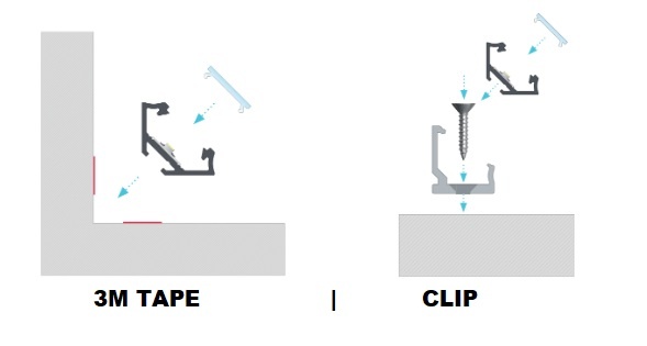De Norman LED strip profiel kan als opbouw profiel gebruikt worden. Je monteert het profiel direct tegen het plafond, wand of gipsplaat met een montagebeugel (artikelnummer LLA2684). Of gebruik een stevige 3M Dubbelzijdige tape.(artikelnummer:LDA1866)