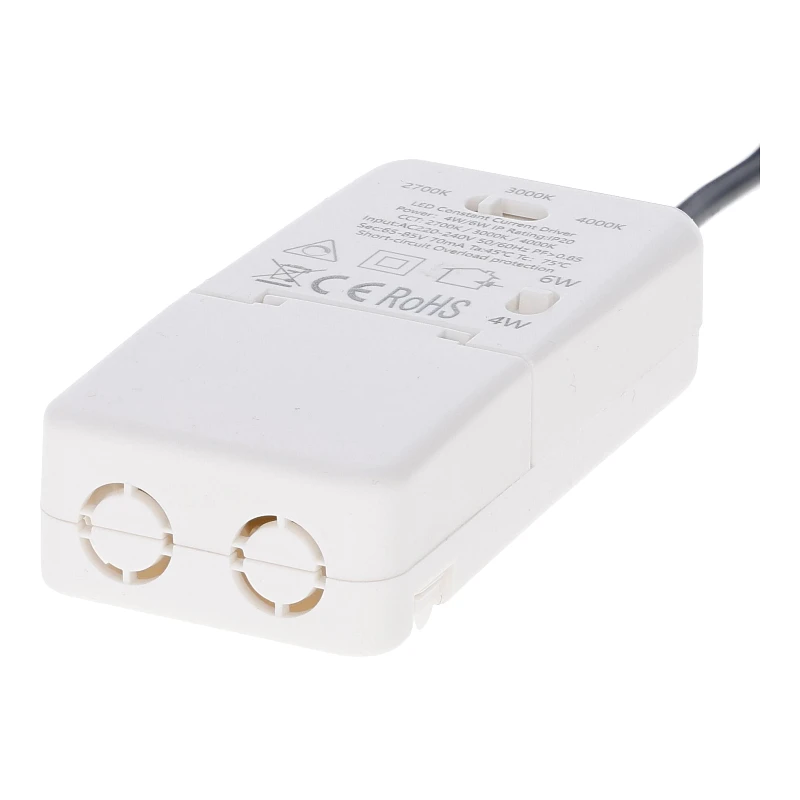 De Flat LED Spot wordt geleverd met externe flikkervrije voeding van 10x4,5x2,4cm(LxBxH). Op de voeding kan je de lichtkleur aanpassen in 2700K, 3000K en 4000K. Ook is het mogelijk de wattage in te stellen op 4 watt en 6 watt