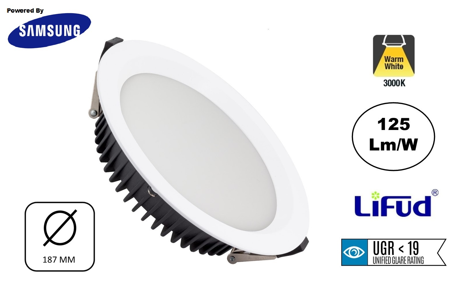 De Samsung Leds van de 20w led downlighter zwart zitten verdiept in het armatuur waardoor er een betere lichtverspreiding van 110 graden is. De diffuser van de LED Downlighter beschikt over een UGR<19 lichtfilter wat zorgt dat er een zeer lage verblindingslicht aanwezig is.