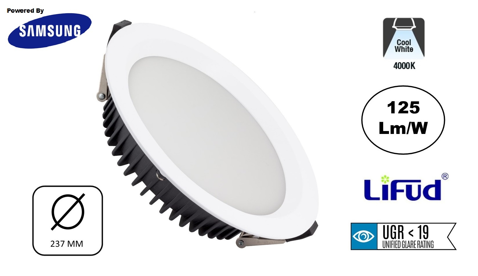 Deze zeer hoogwaardige kwaliteit LED Downlighter 50w is gemaakt van de beste kwaliteit componeten. De Led DOwnlighter is voorzien van zeer krachtige Samsung LEDS met 125 Lumen per watt en wordt geleverd met A kwaliteit Lifud LED Driver.