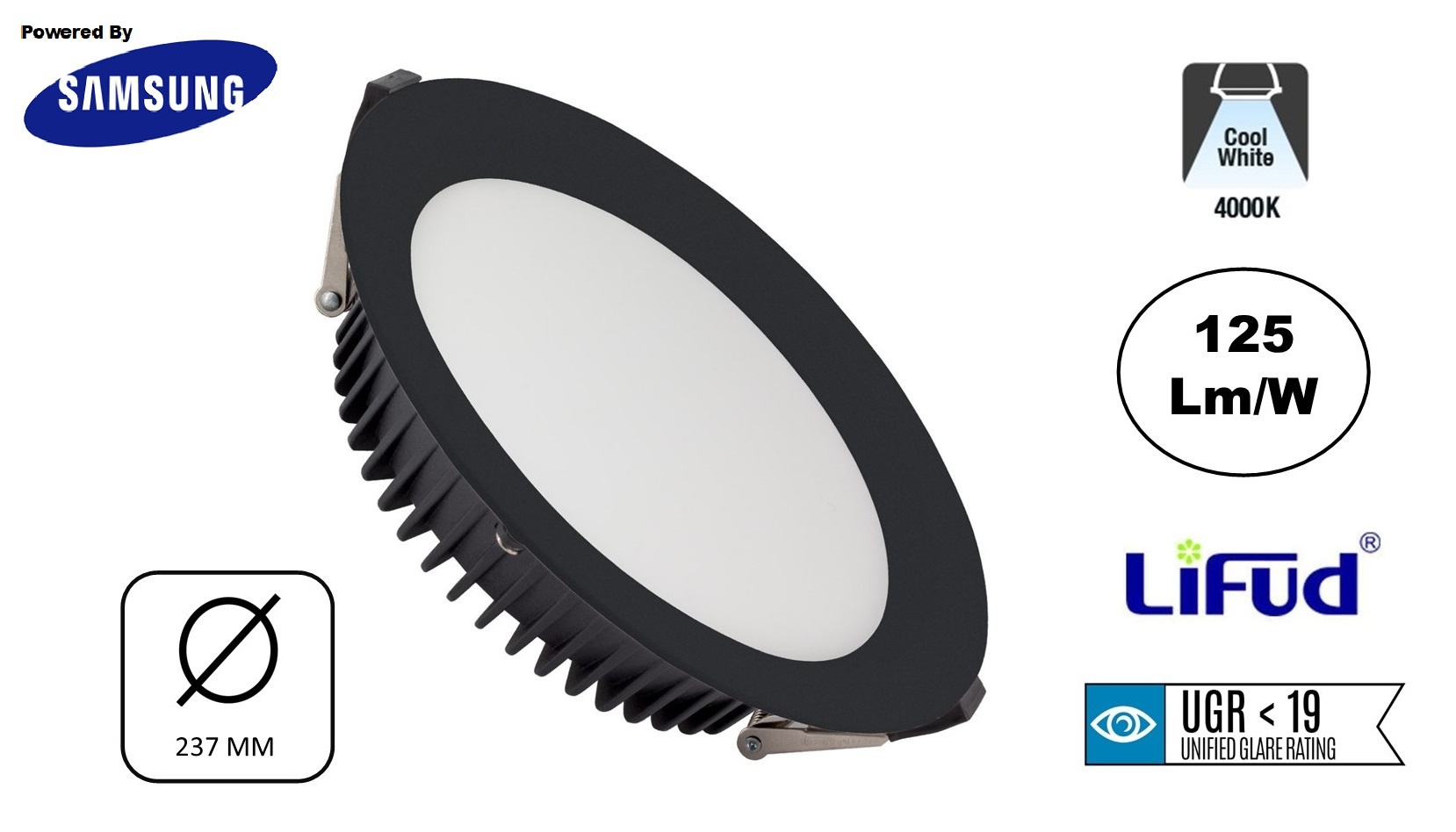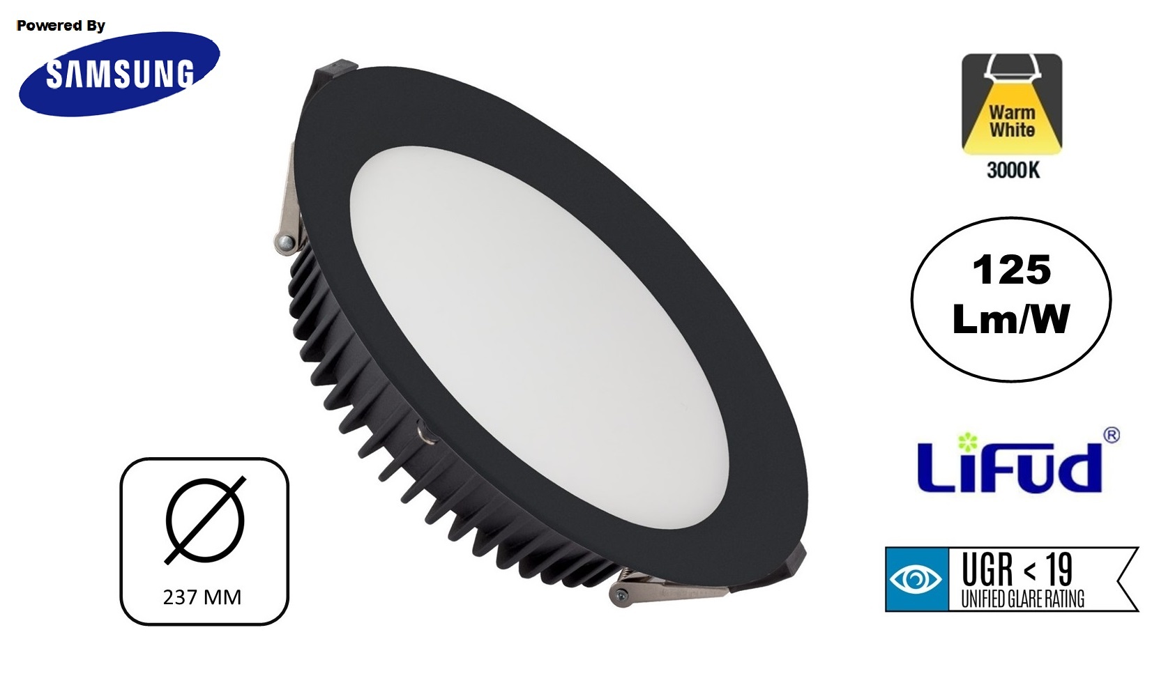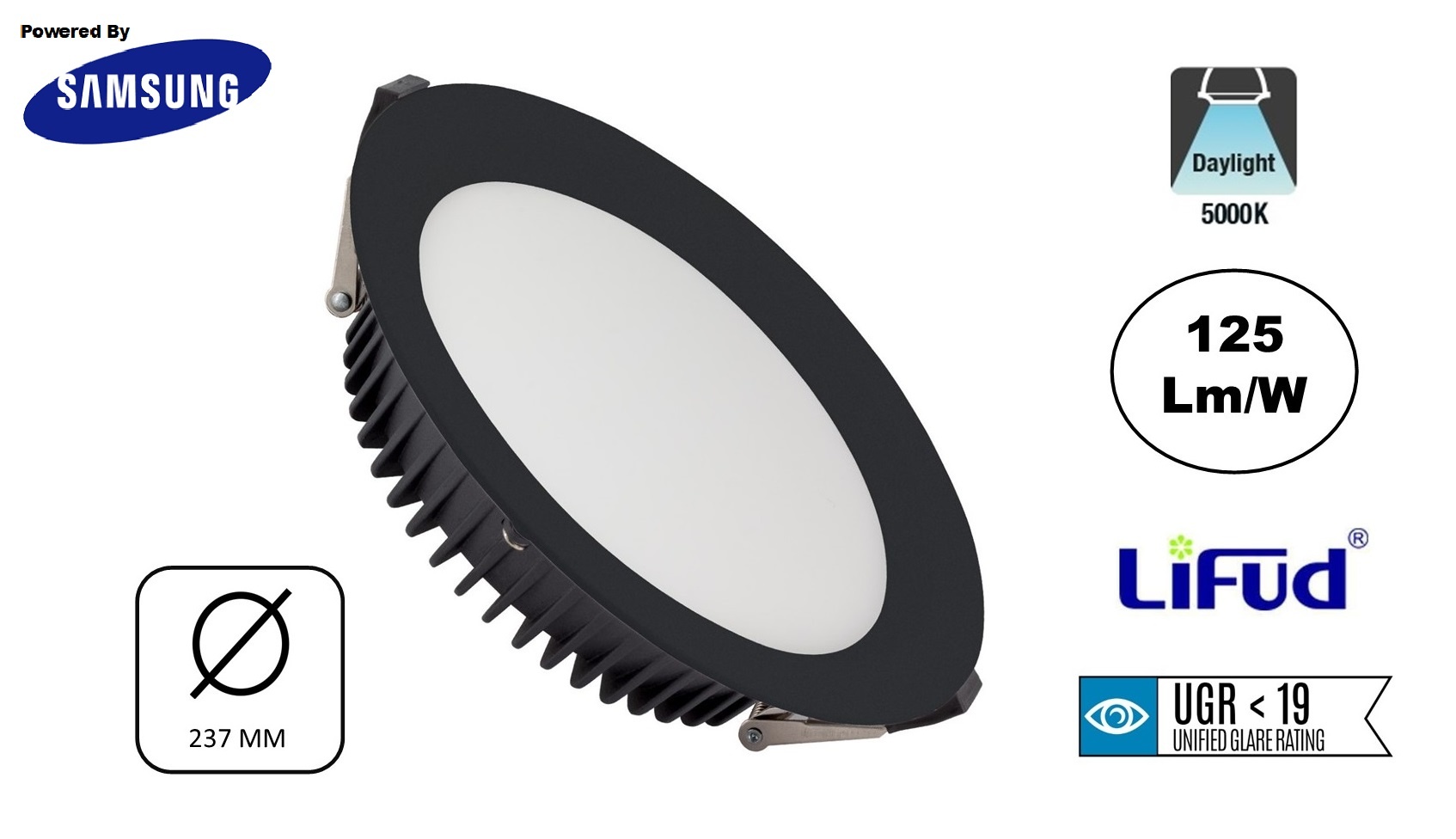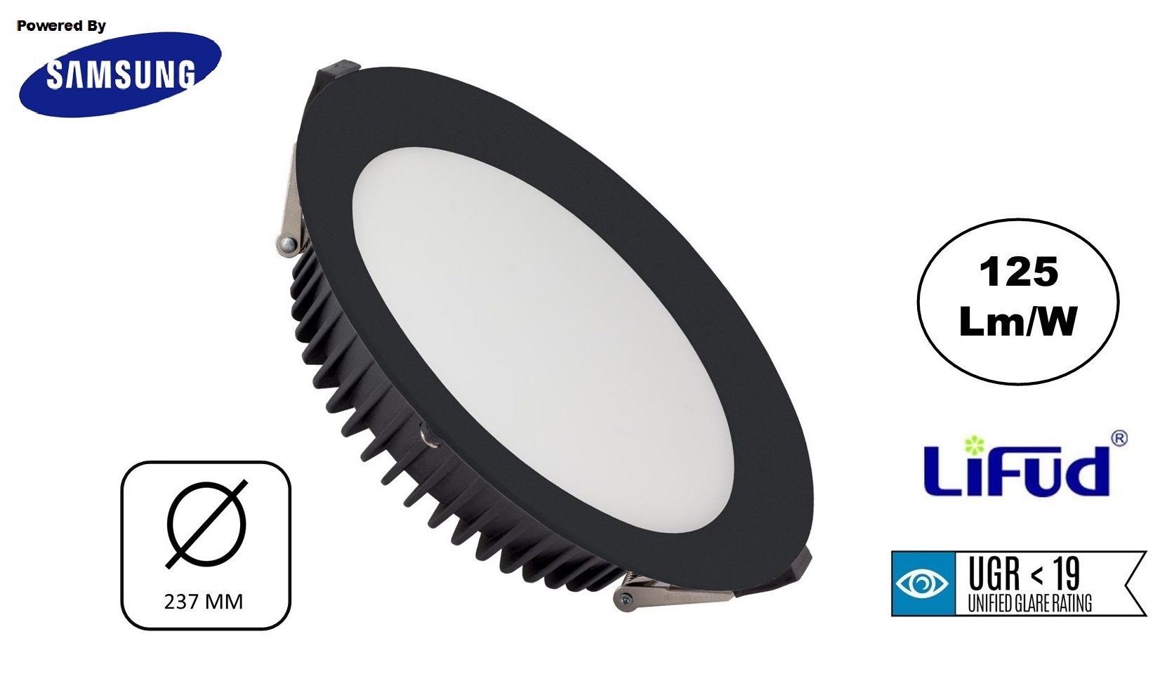 De Samsung Leds van de 50w led downlighter zwart zitten verdiept in het armatuur waardoor er een betere lichtverspreiding van 110 graden is. De diffuser van de LED Downlighter beschikt over een UGR<19 lichtfilter wat zorgt dat er een zeer lage verblindingslicht aanwezig is.