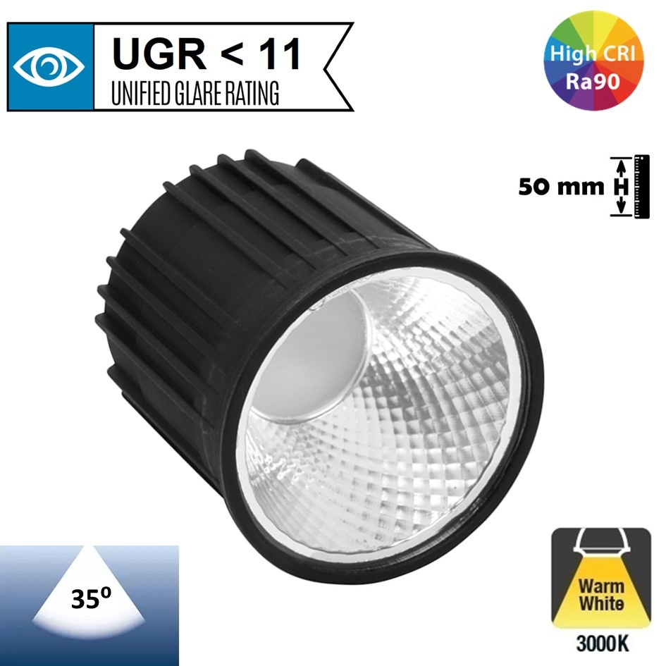 Deze LED Module 9w is een goed alternatief voor GU10 Spots. Dankzij de verdiepte LED is er een minimale verblindingsfactor UGR<11. De verdiepte LED in combinatie met de reflector spiegels maken de LED Module een LUXE LED Spot in elke ruimte.