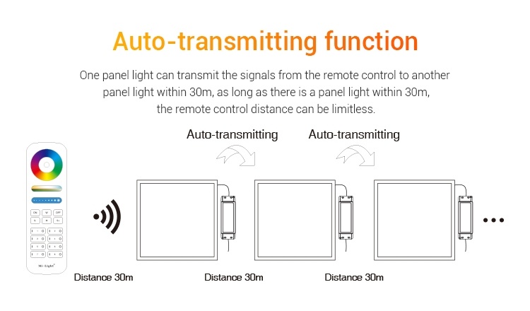 Met de RGB+W remote control is het mogelijk de RGB+CCT Led paneel 30x30cm op elke gewenste lichtkleur in te programmeren. Tevens is het mogelijk om het paneel traploos te dimmen. Op één RGB+CCT remote control is het mogelijk om meerder LED Paneel RGBCCT 30x30cm te programmeren.