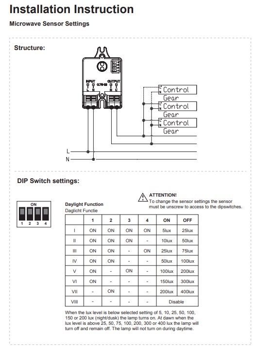 De LED Galerijlamp is voorzien van een losse Daglichtsensor die intern in het armatuur is weggewerkt. Het voordeel van een losse sensor is dat je deze altijd kan vervangen en de waterdichtheid van het armatuur wordt gegarandeerd. De daglichtsensor kan door middel van dip-switches tussen de 5 en 400 lux worden ingesteld. Of je kan de sensor uitschakelen. Voor meer informatie zie afbeelding