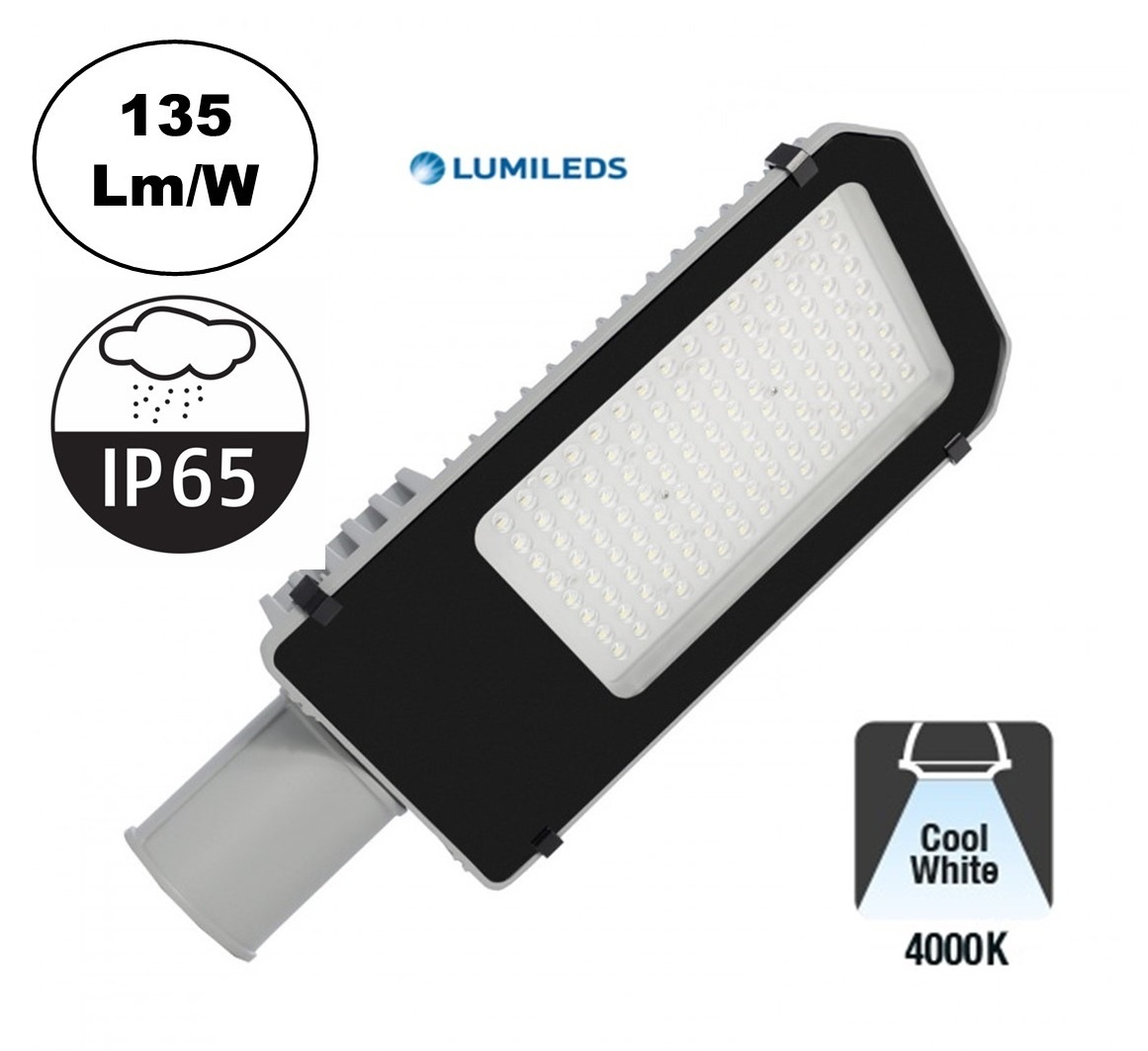 De 100W LED straatlamp is gemaakt van geïnjecteerd aluminium en glas, heeft een IP65 beschermingsfactor die de armatuur bestand maakt tegen alle soorten weersinvloeden. De aluminium behuizing heeft een chemisch en mechanisch anti-corrosieve behandeling gehad en is bestand tegen UV-stralen waardoor de duurzaamheid verder verbetert.
