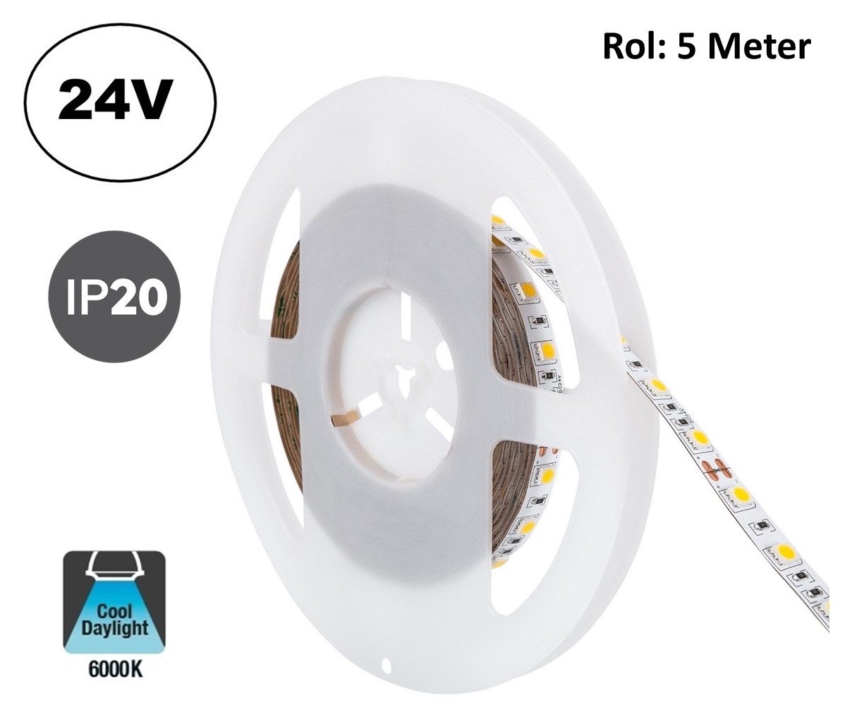 Deze led strip 5050 smd in 6000K Daglicht wit werkt op een 24v constante spanning. Wij hebben in ons assortiment diverse wattage 24v constante led strip drivers vanaf 75w leverbaar.