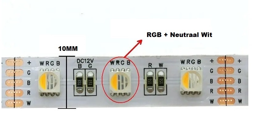 De RGB+Neutraal Wit Led Strip 5050 kan om de 10cm worden afgeknipt om de juiste lengte te creëren.