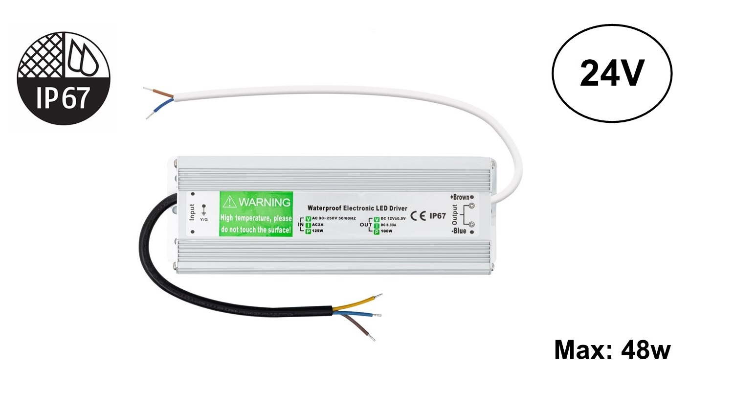 Deze 24V Led strip voeding heeft een beschermingsfactor IP67, waardoor hij volledig weerbestendig is.