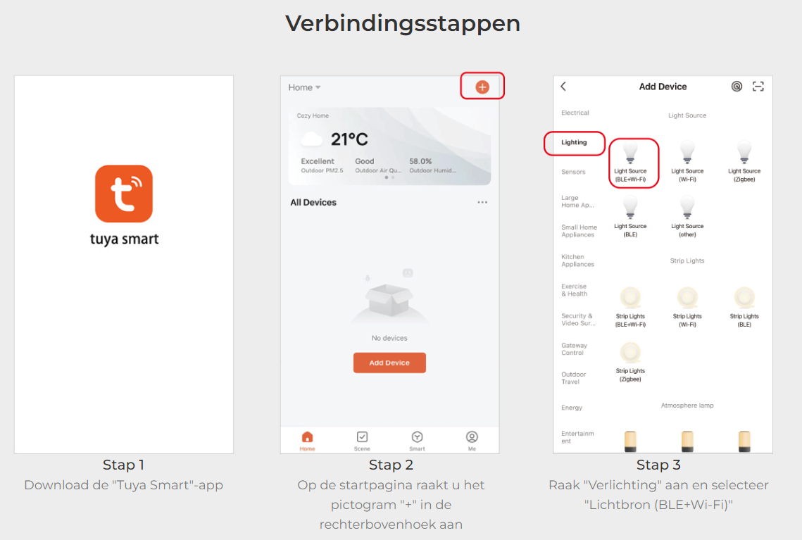 Met de Tuya Smart app (in de app store en google play store) en een Wifi hub, koppelt u alle Miboxer verlichtingsbronnen, stekkerdoos en schakelaars werkend op 2.4Ghz. Zo creëert u uw eigen Smart omgeving.