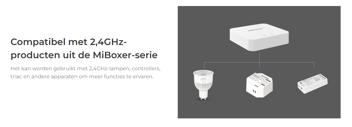 Bedien met deze compacte iBox zowel LED lampen als ledstrip controllers en spots in alle milight uitvoeringen: wit, dual white, RGB kleur, RGBW kleur+wit en de nieuwste RGBWW standaard Kleur+Dual White.