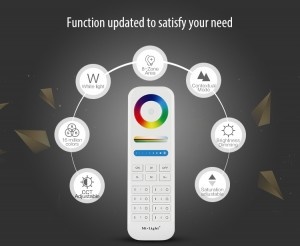 Met de RGB+CCT remote control is het mogelijk de RGBCCT LED panelen, LED downlighters, LED strips en LED lampen op elke gewenste lichtkleur in te programmeren. Ook is het mogelijk om met de afstandsbediening te dimmen.