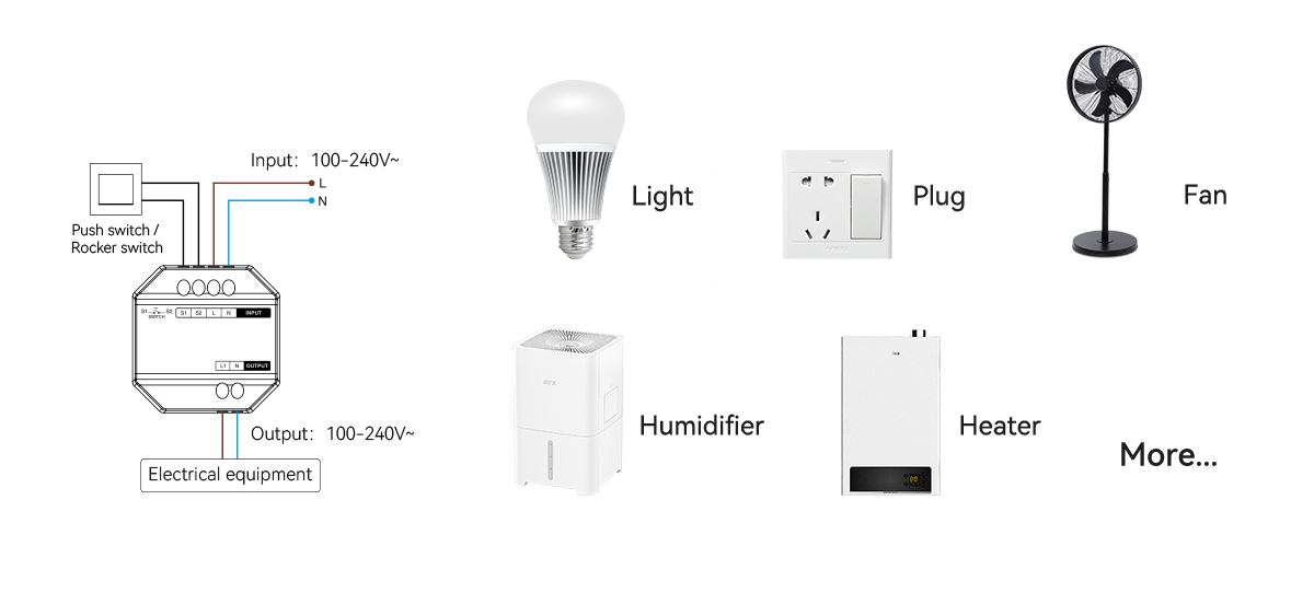 Deze draadloze ontvanger is geschikt voor het schakelen van 230v verlichting of apparaten met een maximale belasting van 10A . Deze ontvanger is draadloos te besturen met een Single Color RF Muurdimmer, met een Single Color RF Afstandsbediening of via de App.
