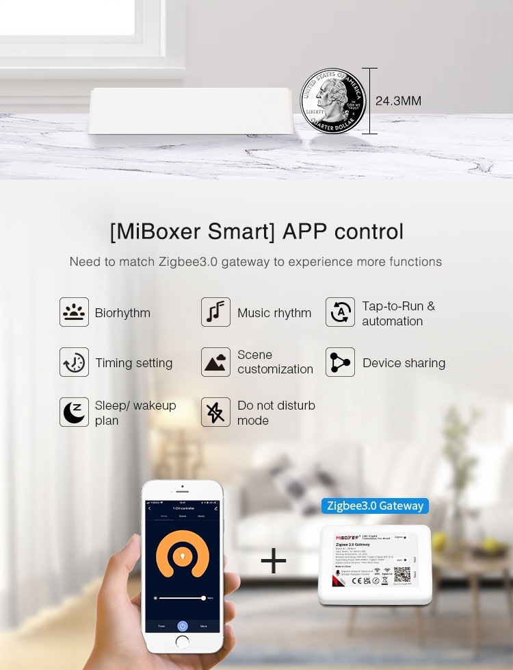 Naast de Zigbee 3.0 werkt deze Miboxer LED controller ook op 2.4Ghz protocol. Het is mogelijk om alle Single Color en CCT afstandsbediening van Miboxer te koppelen aan de LED controller. Je hoeft dan niet altijd de bediening via een App te laten verlopen, maar kan ook via een afstandsbediening. Zie gerelateerd producten