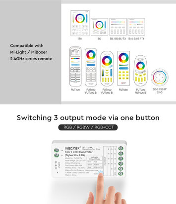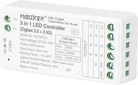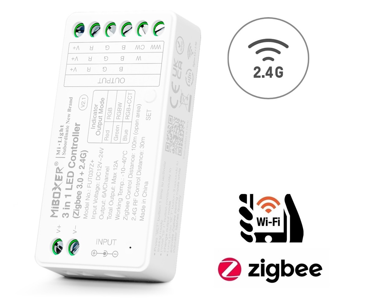 Miboxer Zigbee 3.0 + 2.4 Ghz, 3 in 1 LED Strip Controller RGB / RGB+W / RGB+CCT 12-24VDC, 12A, Werkt via Zigbee 3.0 / App / Wifi / 2.4Ghz