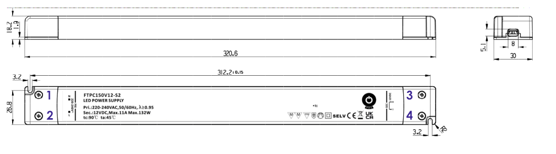 Deze LED strip voeding heeft een maatvoering van 321x30x18mm en is daarom zeer geschikt voor het gebruik in kasten, wanden en plafond met minimale inbouwhoogte.