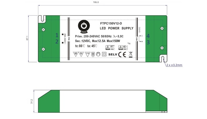 Deze LED strip voeding heeft een maatvoering van 170x57x31mm en is daarom zeer geschikt voor het gebruik in kasten, wanden en plafond met minimale inbouwhoogte.