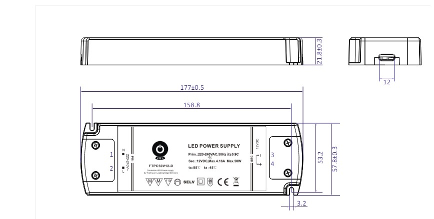 Deze LED strip voeding heeft een maatvoering van 177x58x22mm en is daarom zeer geschikt voor het gebruik in kasten, wanden en plafond met minimale inbouwhoogte.