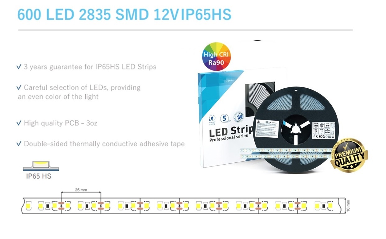Deze LED strip is voorzien van een IP65HS normering. Het verschilt tussen een IP65 en een IP65HS is dat de strip voorzien is van een krimpkous die de LED strip stof en spatwaterdicht maakt. Hierdoor is de strip vlakker en makkelijker te verwerken.