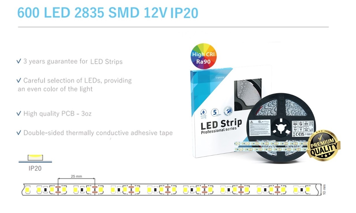 Deze LED strip uit de Premium Serie is voorzien van 120 LEDS per meter met een lichtopbrengst van 850 Lumen per meter. De strip is voorzien van een High Quality PCB Board waarop de LED gemonteerd zit. Dit samen de met dubbelzijdige warmtegeleidende plakstrip zorgt voor een langere levensduur en betrouwbaarheid van de LED strip.