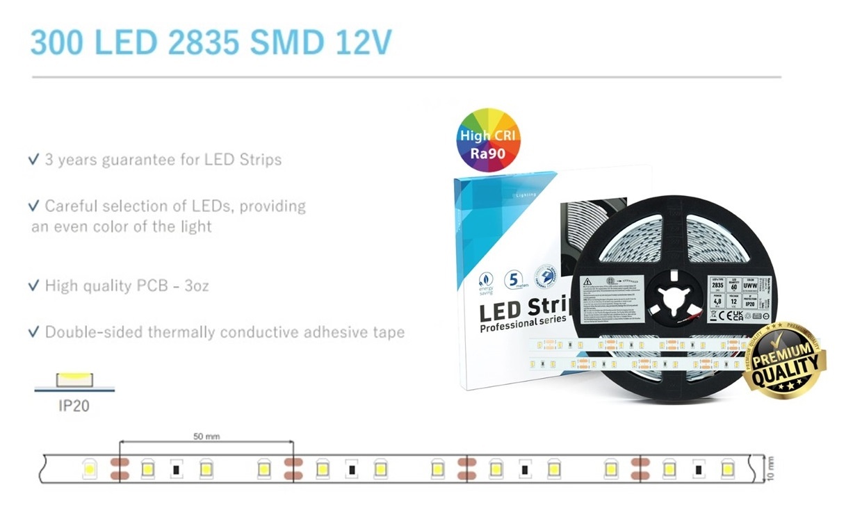 Deze LED strip uit de Premium Serie is voorzien van 60 LEDS per meter met een lichtopbrengst van 432 Lumen per meter. De strip is voorzien van een High Quality PCB Board waarop de LED gemonteerd zit. Dit samen de met dubbelzijdige warmtegeleidende plakstrip zorgt voor een langere levensduur en betrouwbaarheid van de LED strip.