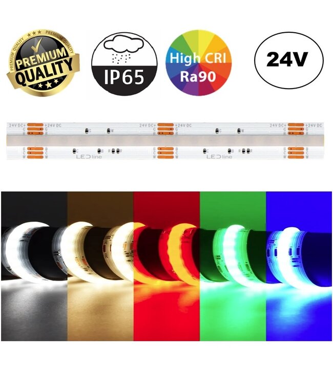 Deze COB Led Strip is voorzien van een RGB+CCT Functie waarbij gebruik is gemaakt van Rode LED, Groen LED, Blauwe LED, Warm Witte LED en Koud Witte LED. Door het mengen van deze mengeling van deze kleuren waardoor je uit meer dan 12 miljoen kleuren kan kiezen of kies een lichtkleur tussen den 2700K Warm Wit en 6500K Daglicht Wit. Hierdoor is de COB RGBCCT LED Strip een sfeermaker in elke ruimte. Deze led strip heeft een IP65 normering wat betekent dat deze voor binnenshuis en in vochtige ruimte gebruikt kan worden. Heeft een zeer hoge kleurechtheid weergave van CRI90. Hoe hoger de CRI van LED verlichting is, hoe betere de werkelijke kleuren in een ruimte tot zijn recht komen.