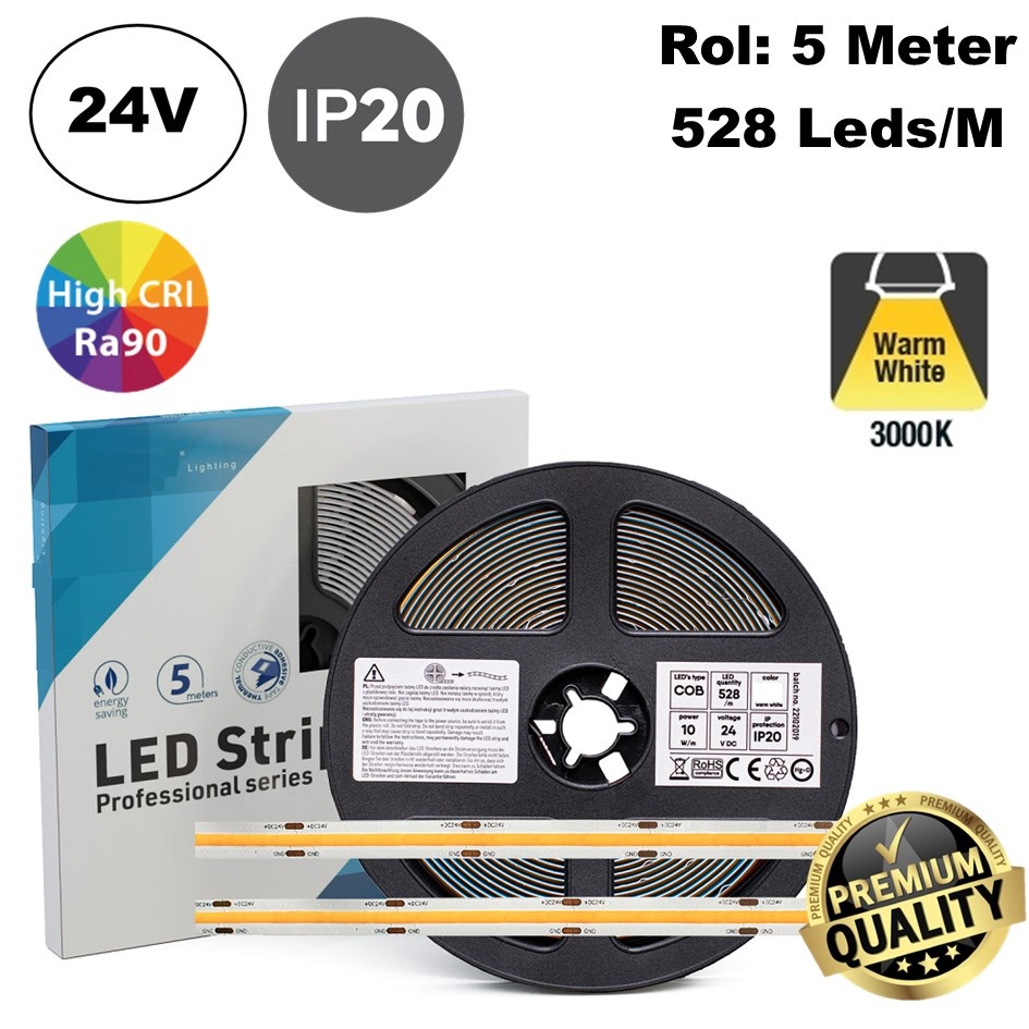 Deze unieke COB LED strip uit de Premium Serie is voorzien van 528 LEDS per meter met een lichtopbrengst van 900 Lumen per meter. De strip is voorzien van een High Quality PCB Board waarop de LED gemonteerd zit. Dit samen de met dubbelzijdige warmtegeleidende plakstrip zorgt voor een langere levensduur en betrouwbaarheid van de LED strip. De krachtige maar kleine Leds zijn zeer dicht op elkaar gemonteerd en voorzien van een Fosfor laag. De Fosfor laag zorgt dat het licht egaal over de strip wordt verdeeld waardoor je een strakke lichtverdeling hebt zonder led puntjes.