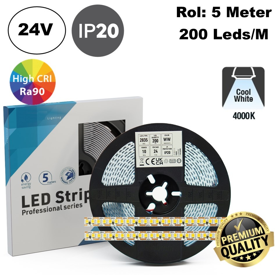 Deze led strip in 4000K Neutraal wit werkt op een 24v constante spanning. Wij hebben in ons assortiment diverse wattage 24v constante led strip drivers.